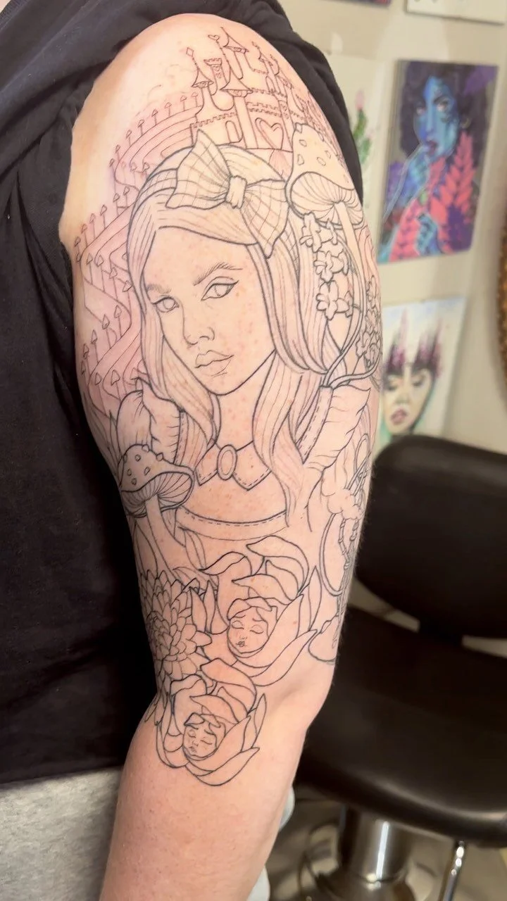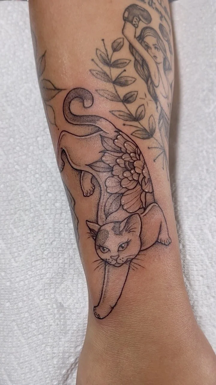 Through the art of tattooing, she’s known for translating her 2D imagery onto a new canvas; skin.